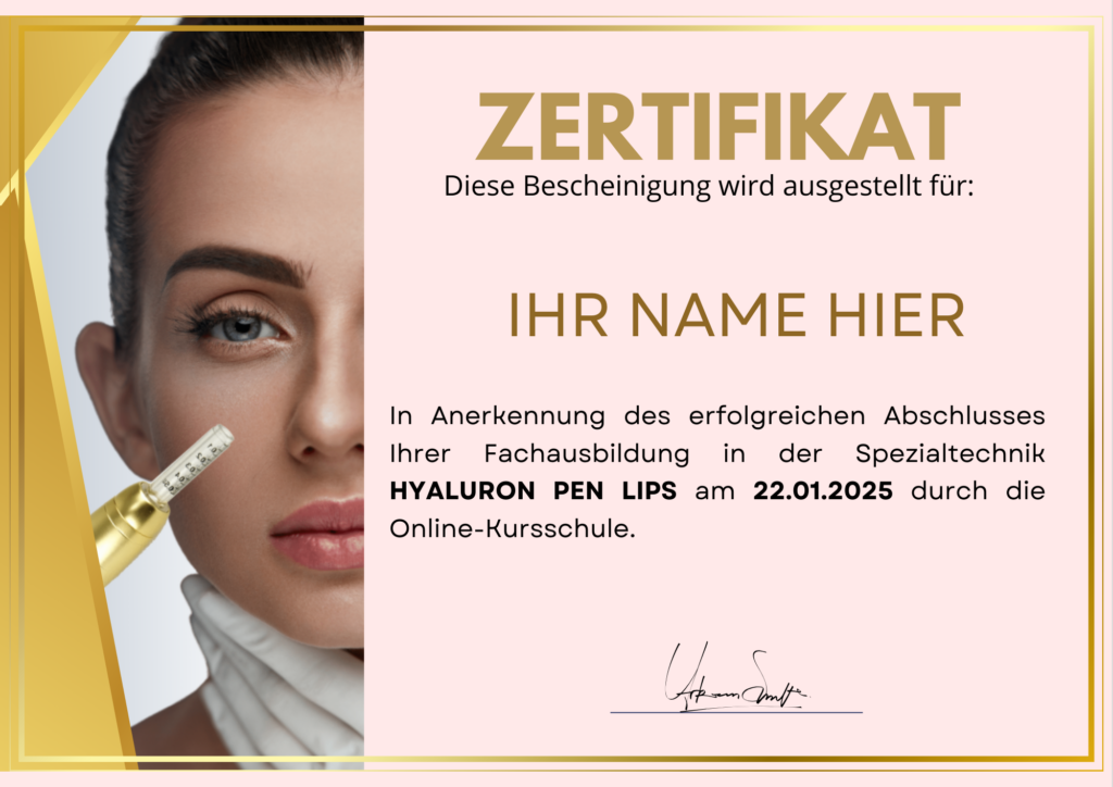 Der Kurs Hyaluron Pen Lips wurde mit größter Sorgfalt und Liebe zum Detail für alle konzipiert, die diese innovative nadelfreie Fülltechnik beherrschen möchten. Egal, ob Sie ein Anfänger (ohne Erfahrung in der Ästhetik) oder ein erfahrener Profi sind, der seine Fähigkeiten verbessern und neue Techniken entdecken möchte, dieser Kurs ist für Sie! Viele Kursteilnehmer setzen das in diesem Kurs Gelernte bereits in die Praxis um und bieten einen einzigartigen Service auf dem Schönheitsmarkt an. Dieser Kurs wurde entwickelt, damit JEDER lernen und seine Kunden mit natürlichen und sicheren Ergebnissen begeistern kann. 🚀