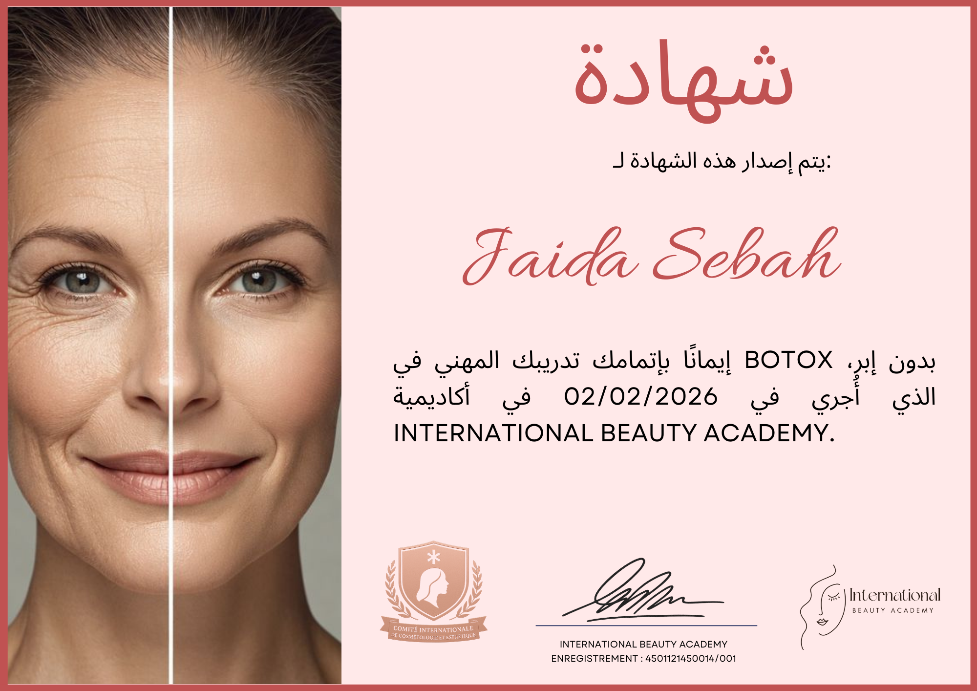« اكتشفت أكاديمية Le Visage Beauty على إنستغرام، وفي ذلك اليوم، تغيّر كل شيء! سجلت في العديد من الدورات، تعلّمت جميع الأسرار، بدأت أتمرّن على صديقي، ثم على عمّاتي، والآن لدي أكثر من 80 عميلة وفية كل شهر. أنا أعيش حلمي أخيرًا، أساعد عائلتي وأحب هذا المسار تمامًا. أنصح دائمًا بهذه الدورة، لن تندموا! »